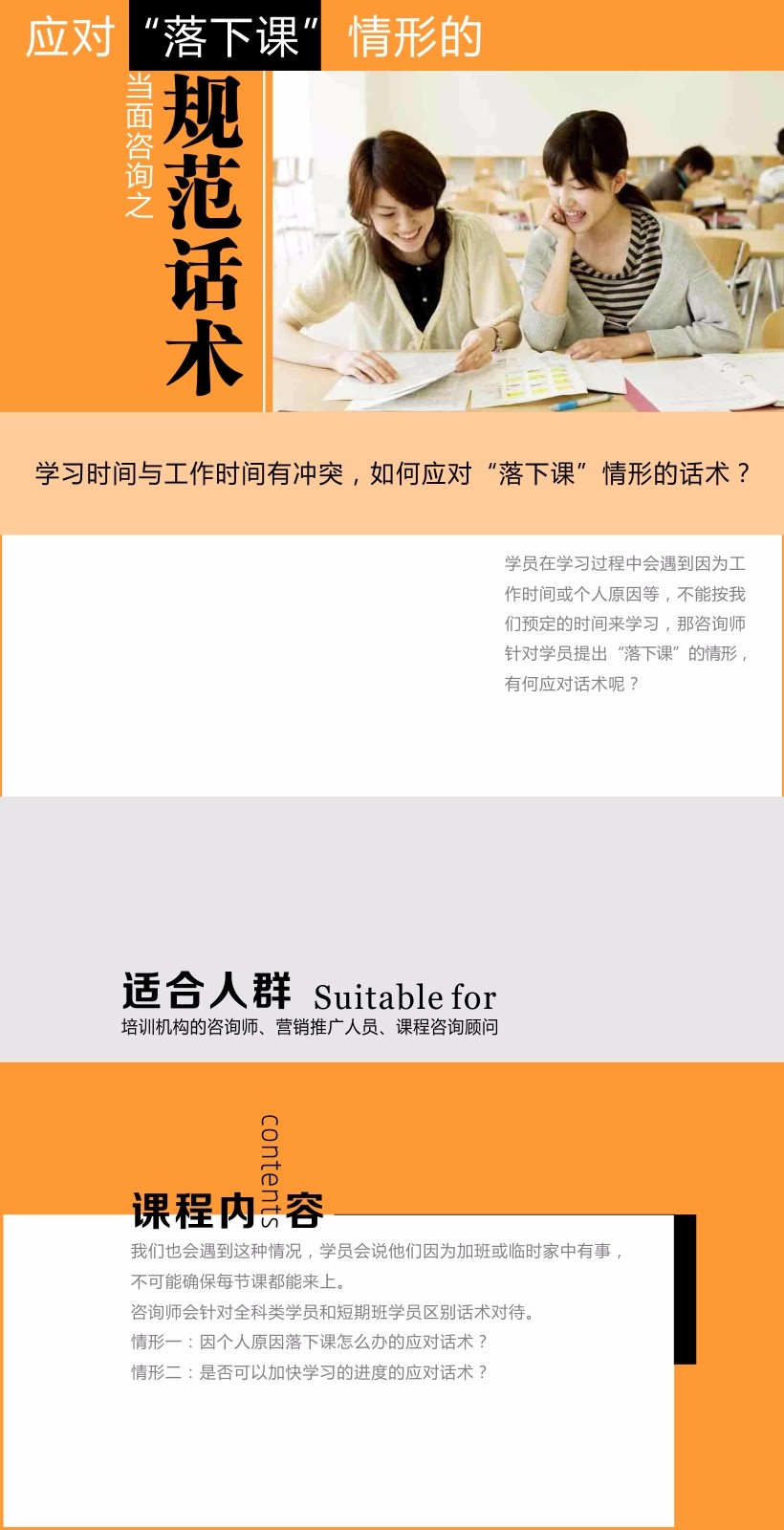 课程简介:当面咨询之应对“落下课”情形的规范话术